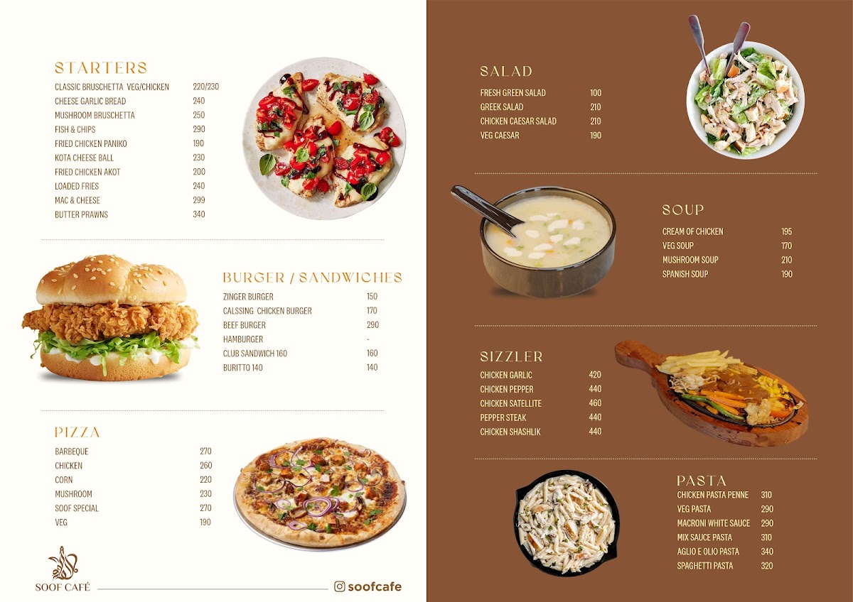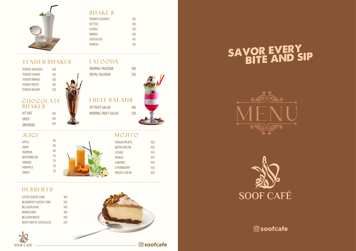 The menu at Soof cafe in Thalappara, Moonniyur offers a variety of options organized into distinct categories suitable for different dining occasions, including light meals and casual dining. Customers can choose from a selection of starters, salads, and desserts, providing both vegetarian and non-vegetarian choices.